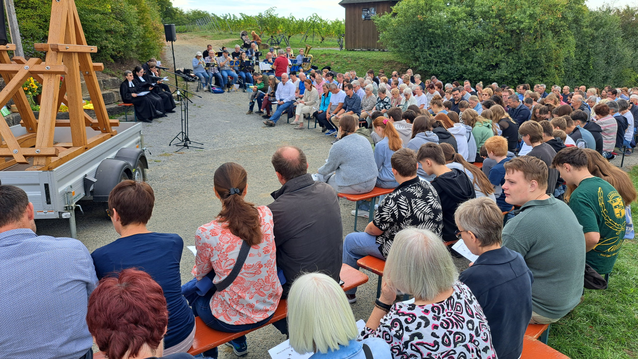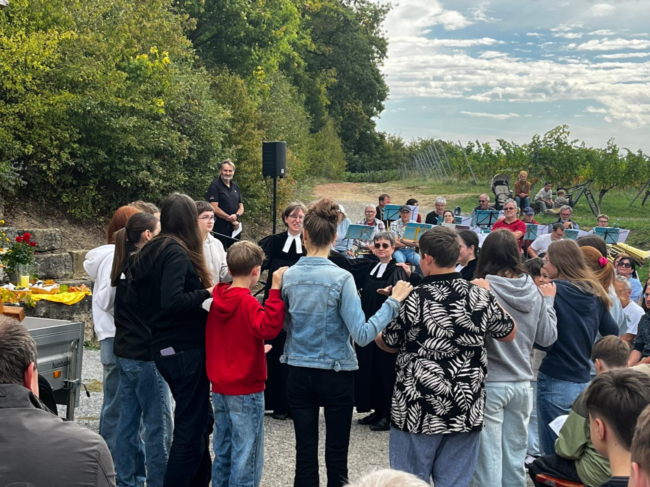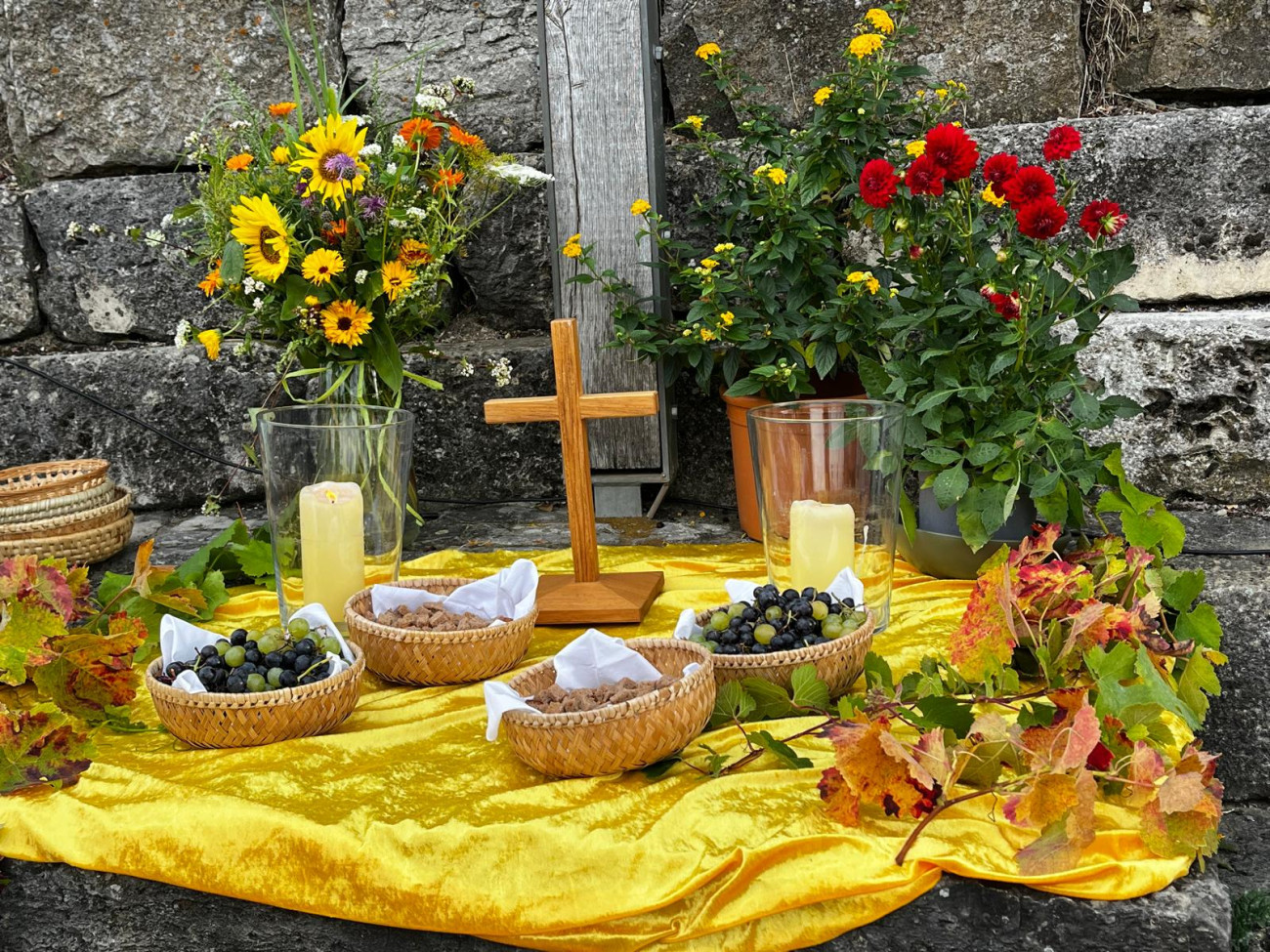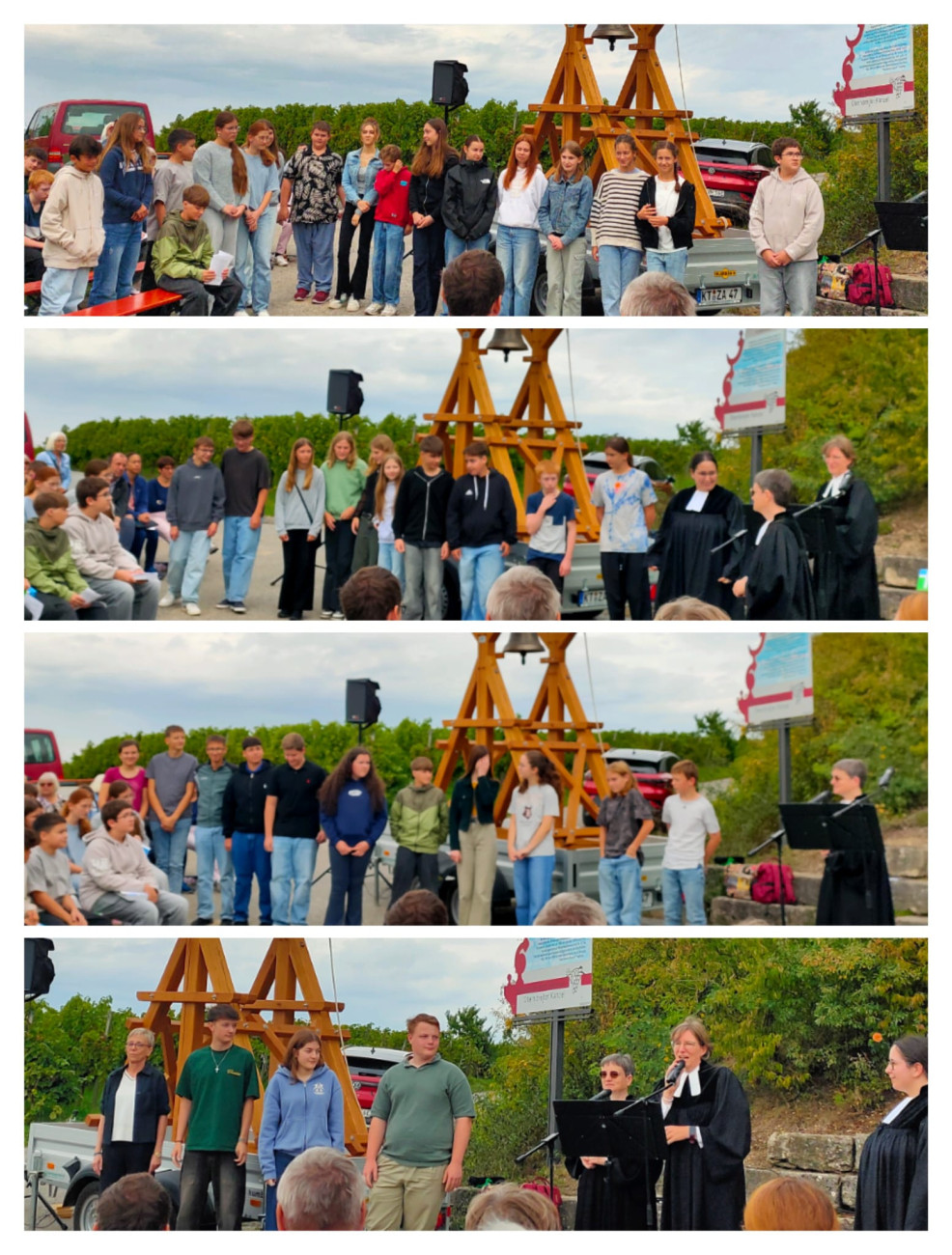 In diesem Gottesdienst bei angenehmen Spätsommerwetter, geleitet von den Pfarrerinnen Beate Krämer, Eva Thelen und Vikarin Thomayer, haben wir unseren neuen Konfirmandenjahrgang aus Marktsteft, Michelfeld, Marktbreit, Segnitz und Obernbreit begrüßt und vorgestellt. Den Konfirmandinnen und Konfirmanden wurde der Segen Gottes für ihre weitere Konfi-Zeit zugesprochen und es wurden ihnen bei dieser Gelegenheit die neuen Konfi-Bibeln ausgehändigt, die sie während des Konfi-Kurses begleiten sollen. Die zahlreich erschienenen Gottesdienstbesucher aus dem südlichen Dekanatsbezirk feierten als Höhepunkt des Freiluftgottesdienstes gemeinsam das heilige Abendmahl mit Brot und Trauben. Herzlichen Dank an alle, die den Gottesdienst vorbereitet und begleitet haben sowie an den Posaunenchor Marktsteft unter der Leitung von Walter Dienesch für die musikalische Gestaltung.